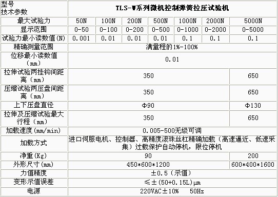 產(chǎn)品概述: TLS-WI系列微機控制拉壓彈簧試驗機依據(jù)JB/T7796-2005《拉壓彈簧試驗機技術(shù)條件》規(guī)定的技術(shù)要求制成。該型拉壓彈簧試驗機主要用 于測試各種螺旋彈簧及彈性元件的強度,即在一定的變形量(或高度)下測試彈簧的試驗力或在一定的試驗力下測定彈簧的高度或變形量。 功能特點: 本機主要適用于各種彈簧的強度試驗、力學(xué)性能及工序能力分析。 本機軟件包有速度控制、參數(shù)輸入、數(shù)據(jù)處理、結(jié)果觀察、圖表顯示、圖表打印、數(shù)據(jù)保存等功能模塊組成。 試驗方式多樣化,可以設(shè)置彈簧的試驗力,數(shù)顯彈簧試驗機,檢測彈簧的剩余高度或變形量;也可以設(shè)置彈簧的剩余高度或變形量,檢測試驗力等功能。 多點自動變速采集數(shù)據(jù),并自動返回到初始位置,整個試驗過程自動化。 過載自動返回,高精度彈簧試驗機,以保護傳感器不受損壞。 具有強大的數(shù)據(jù)處理及數(shù)據(jù)統(tǒng)計功能,繪制剛度曲線、計算彈簧的分段剛度,可以進行數(shù)據(jù)統(tǒng)計,繪制正態(tài)分布圖、計算工序能力指數(shù)。采用數(shù)控電機調(diào)速系 統(tǒng)或進口交流伺服電機及調(diào)速器和精密滾珠絲杠副組成傳動系統(tǒng),與高精度負(fù)荷傳感器、位移傳感器及數(shù)字式數(shù)據(jù)采集卡、PC組成測控系統(tǒng),數(shù)顯式彈簧拉壓試驗機,實現(xiàn)了穩(wěn)定可靠運行 及精確測量。 技術(shù)參數(shù): ![]() ![]()
