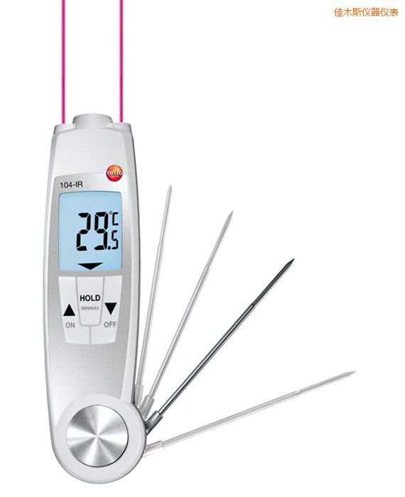 紅外及接觸式測溫二合一testo 104-IR配備精確的2點瞄準激光,數(shù)字溫度計,光學分辨率10:1,土壤溫度計,測量范圍清晰可見,溫度計的發(fā)展史,可隨時進行快速并精確的表面溫度測量。二合一溫度測量儀特別適用于食品進貨檢測以及快速檢測單個或整箱食品的表面溫度。 刺入式溫度探頭適用于測量如肉類和香腸等食品的核心中心溫度。通常,在紅外表面溫度測量不足以判定食品安全的情況下使用。刺入式探頭在不使用時可通過折疊方式收入儀器中,溫度計的結(jié)構,以防折斷損壞。