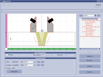 隨后這些設(shè)置信息需要高級超聲技術(shù)人員進(jìn)行驗(yàn)證。每個(gè)焊縫分成多個(gè)TOFD和相控陣檢測區(qū)域,高級技術(shù)人員可以通過聲束模擬功能驗(yàn)證每個(gè)區(qū)域超聲覆蓋是否準(zhǔn)確。也可以通過選擇數(shù)據(jù)庫中的其他探頭,調(diào)整探頭位置。當(dāng)所有的檢測區(qū)域被驗(yàn)證后,檢測方案可以被導(dǎo)出到掃查儀器中。