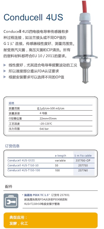Conducell 4US四電極電導(dǎo)率傳感器有多種過(guò)程連接,,如法蘭接頭或不同OP值的G 1¼”連接。傳感器線性度好、測(cè)量范圍寬。耐受蒸汽滅菌,,高壓滅菌和CIP清洗。所有的塑料材料都符合EU 10 / 2011的要求。