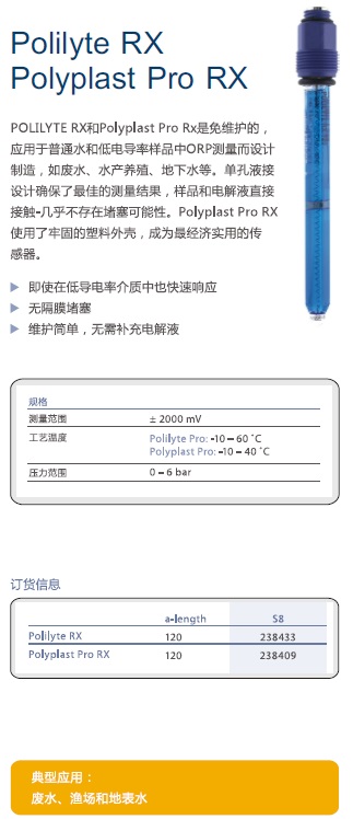POLILYTE RX和Polyplast Pro RX是免維護的,,應用于普通水和低電導率樣品中ORP測量而設計制造,,如廢水、水產(chǎn)養(yǎng)殖、地下水等。單孔液接設計確保了最佳的測量結(jié)果,,樣品和電解液直接接觸-幾乎不存在堵塞可能性。Polyplast Pro RX使用了牢固的塑料外殼,,成為最經(jīng)濟實用的傳感器。