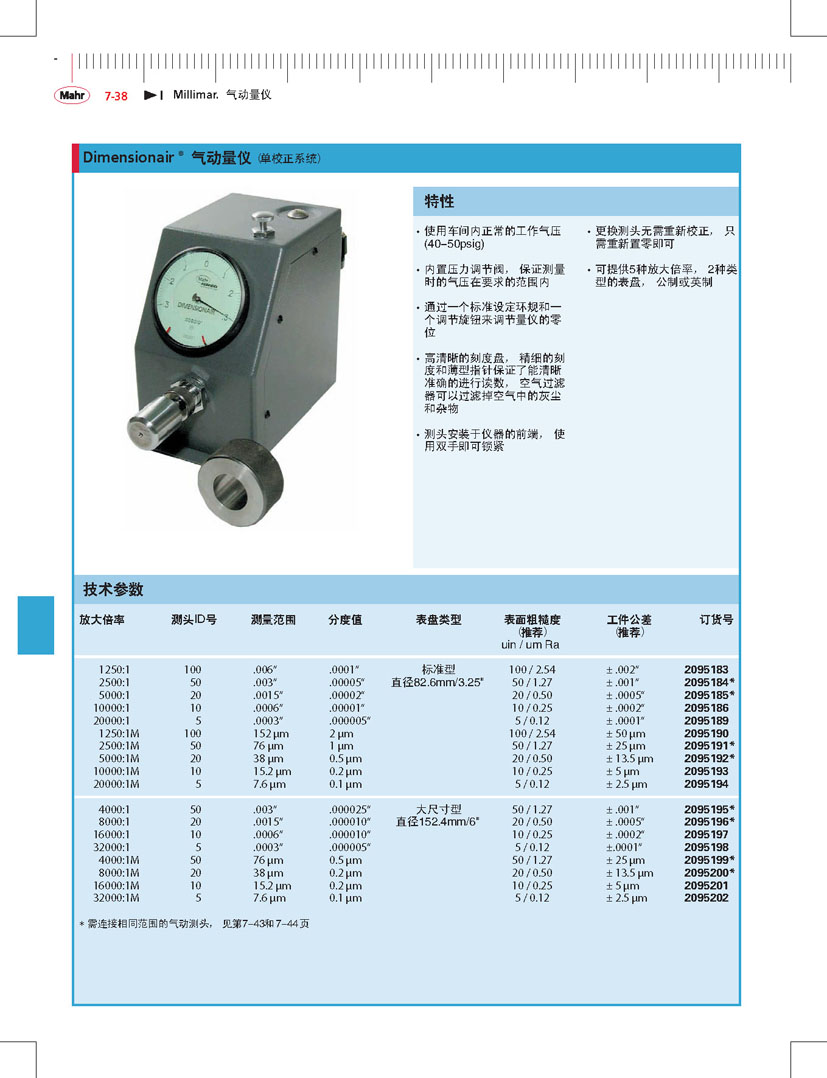 Mahr Federal Dimensionair 氣動量儀是氣動量儀中特有的一個類型。屬于差壓式氣動量儀,它的優(yōu)點在于能提供一個合適的放大倍率和平衡的氣動系統(tǒng)。一個線性的、準(zhǔn)確的校正比例為刻度的劃分、讀數(shù)提供了條件。 馬爾Dimensionair氣動量儀相比于其他氣動量儀具體更大的測量范圍。以保證氣動測量頭與工件表面有足夠大的初始距離。大的測量頭的間隙減少了磨損,,延長了使用壽命。