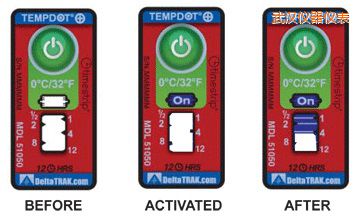 TempDot™Plus標(biāo)簽應(yīng)存儲(chǔ)在室溫下,,并必須在反應(yīng)溫度閾值以上被激活。激活是通過用手指推壓。"On"字出現(xiàn)在第一個(gè)窗口中顯示激活。之后5分 鐘內(nèi),在反應(yīng)溫度或低于反應(yīng)溫度的情況下將標(biāo)簽貼到產(chǎn)品上。藍(lán)色染料熔化并以控制的速率遷移,經(jīng)過白色大窗口。這表示暴露在溫度閾值以上的累計(jì)時(shí)間。當(dāng)溫 度低于閾值時(shí),該染料固化并停止移動(dòng)。如果溫度超過閾值,,TempDot®Plus標(biāo)簽提供即時(shí)的視覺跡象。