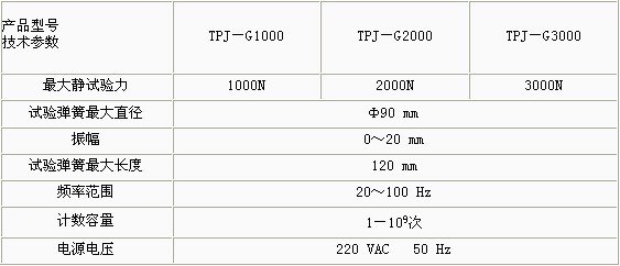 產(chǎn)品概述: TPJ-G系列彈簧高頻疲勞試驗機采用電磁激勵、試件(彈簧)共振原理,空氣彈簧疲勞試驗機,系統(tǒng)自動處于最佳諧振狀態(tài),勿需調(diào)整,手動雙數(shù)顯彈簧拉壓試驗機,起動一觸即發(fā),性能穩(wěn)定可靠。操作簡單,1噸彈簧疲勞試驗機,操作人員勿需培訓。 功能特點: 試驗機設有振動次數(shù)及頻率的數(shù)字顯示及次數(shù)預置、記憶等功能。該機既可以做單對彈簧的試驗,也可做多對彈簧的試驗機。 技術參數(shù):