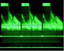 圖2是無Z軸亮度調(diào)制較老數(shù)字示波器的顯示。雖然該示波器甚至在5ms/div時仍有捕獲信號細(xì)節(jié)的足夠采樣率和存儲器深度但所有捕獲點的顯示亮度相同。這就在視覺上丟失了信號包絡(luò)內(nèi)的波形細(xì)節(jié)。因此在選擇模擬示波器技術(shù)還是選擇較老的數(shù)字顯示技術(shù)上不應(yīng)對今天視頻實驗室中充斥模擬示波器感到驚奇!