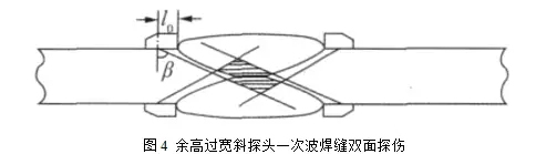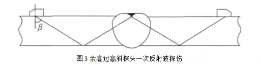 焊縫余高過寬時會出現(xiàn)焊縫中部盲區(qū)克服中部盲區(qū)的辦法是增大探頭角度和減小探頭前沿長度(圖4).